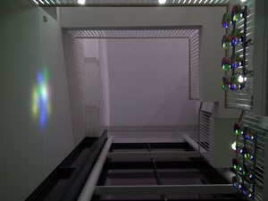 The integral of the colour network is projected by the spot lights on the opposite wall. The spectator's shadows recompose continuously.