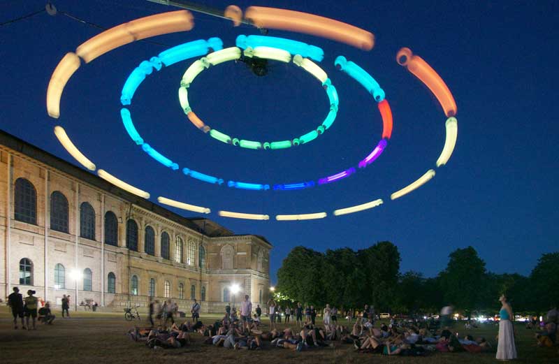 Sound network The acoustic bodies arranged in a circle represent the simplest form of a network, in which, similar to a Mexican wave, the activity of their immediate neighbours determines whether they play and light up in the next time step or just remain off.