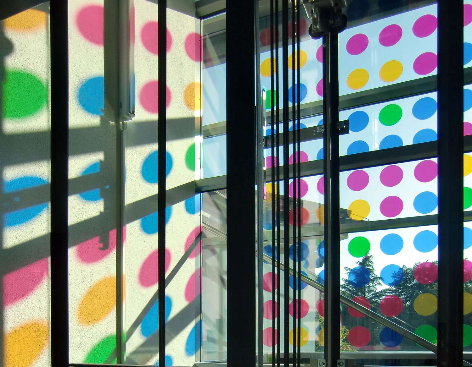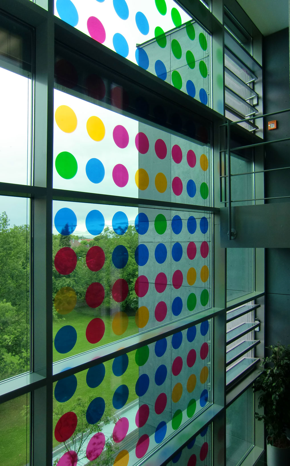 Eine Variante von „Coloursex“ sind ortspezifische Arbeiten, die das Fenster als optisches Element zwischen Innen und Außen aufgreift. Farbige Punkte aus Glaskunstfolie verwandeln die gläserne Schnittstelle in einen minimalistischen Bildschirm. Von oben nach unten können die Arbeiten Linie für Linie als Interaktionsmuster der vier Farben untereinander gelesen werden.