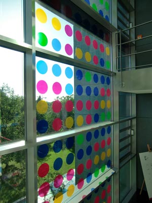 The self-organisation of colour is the core principle of “colour sex”. Colour notations as developed by Paul Klee are enhanced by a dynamic interaction. Based on this principle the first window installations were realized in 2009. Dots of transparent colour foil build a matrix of interacting colours which can be read line by line.